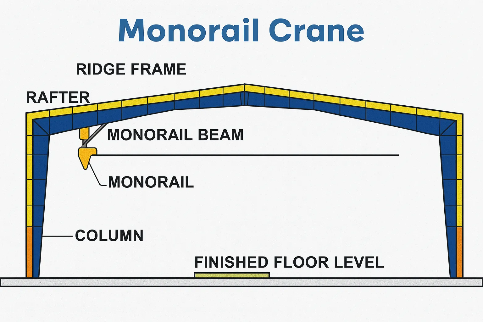 BLUA’s PEB structures are designed to accommodate multiple types of cranes, including EOT, Monorail, and Under-hung cranes, as well as other load-carrying systems such as conveyors. These can be incorporated into both clear-span and multi-span buildings, depending on the project’s operational needs.