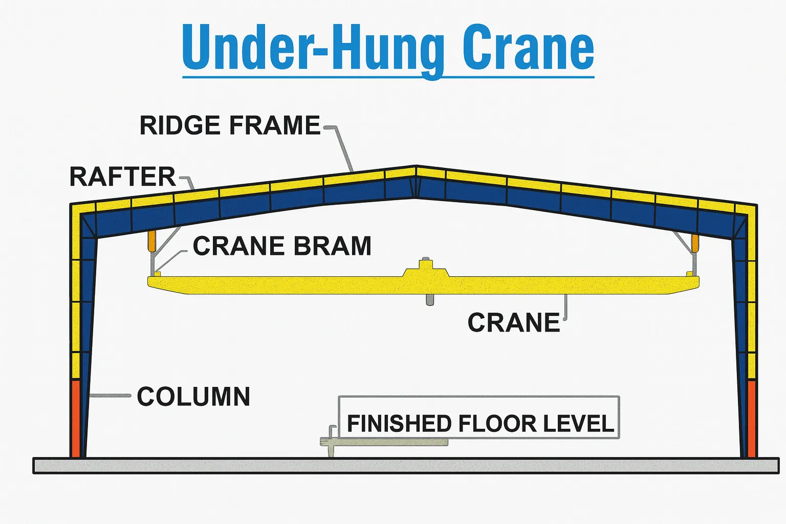 When integrating crane systems, BLUA provides crane brackets and runway beams that support the entire crane mechanism. To ensure accuracy and safety, complete information regarding the crane system is required during the design and estimation phase.
