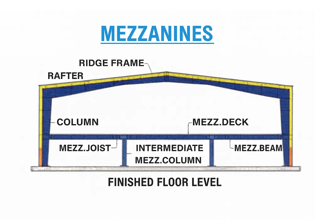 Mezzanine floors consist of Chequered Plates or Galvanized Decking Sheets, supported by joists and main mezzanine beams. The main beams typically span the building’s width and are positioned beneath the main rafters, while the joists run parallel to the length of the structure.